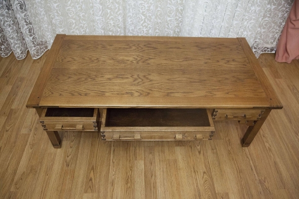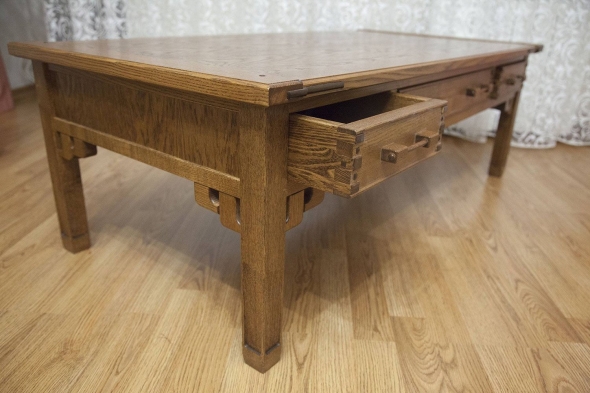 Журнальный столик с тремя ящиками в стиле Greene & Greene. Ящики в классическом исполнении, без направляющих механизмов. Столик изготовлен из массива ясеня. Массив тонирован и покрыт лаком в несколько слоёв.