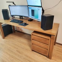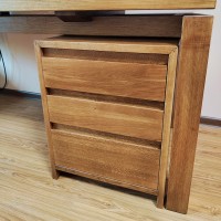 Глубина верхних двух ящиков 15 см, нижнего 25 см. Поверхность массива тонирована и покрыта лаком в несколько слоёв.